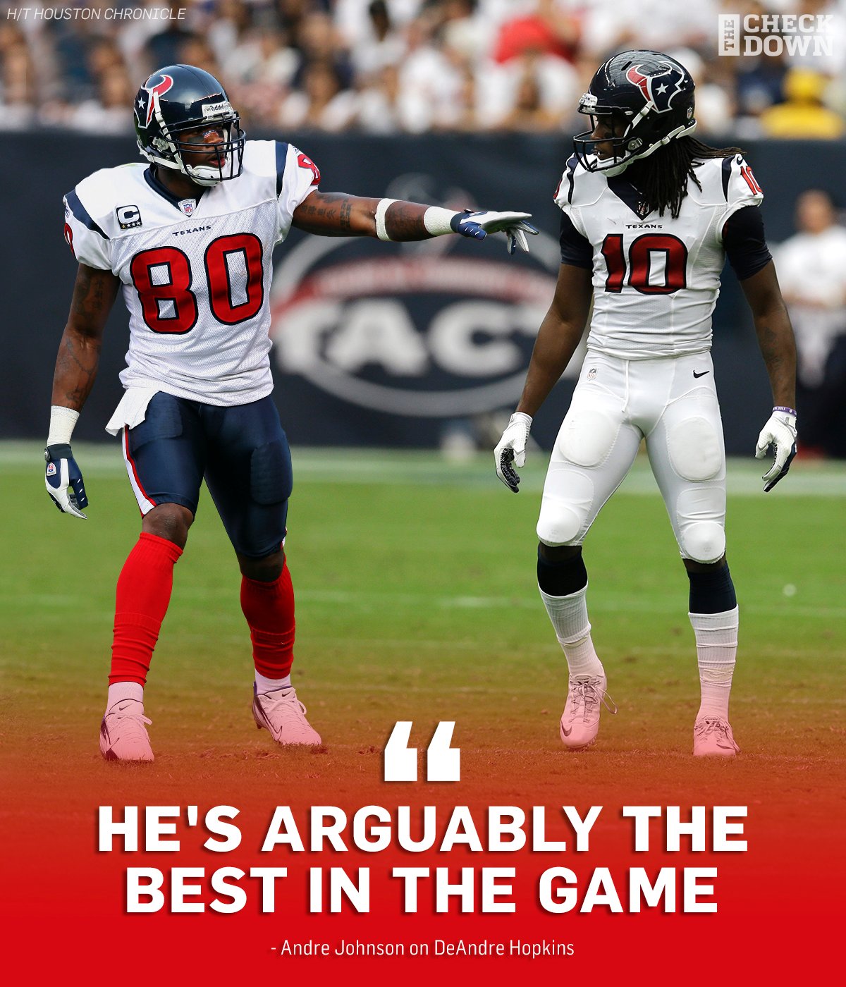 Andre Johnson Says Deandre Hopkins Has Best Hands Of Any Receiver He S Been Around. There was chatter about trades involving cardinals running back david johnson and texans wide receiver deandre hopkins on monday morning. Texans wide receiver deandre hopkins doesn't want people telling him how great he is, he wants people telling him how he can get better. When deandre hopkins entered the nfl in 2013 with the houston texans, it was andre johnson who took the young star from clemson under his wing to teach him the ways of life as a professional. Don't expect him to reach 50 catches with duke johnson having caught 30 passes over the second half of last season. He's talked to me a lot on and off the field. Andre johnson and deandre hopkins gave gifts to families. Johnson, who went to seven pro bowls as a wide receiver for the texans. Adam schefter of espn reported that the cardinals agreed to deal johnson to houston without word on compensation for arizona, but that changed a. Even after johnson departed from the franchise in 2015, the two stayed close in communication. That's why hopkins values his friendship with andre johnson. Deandre hopkins (born june 6, 1992) is an american football wide receiver for the arizona cardinals of the national football league (nfl). Acquired in a deal that sent deandre hopkins to arizona, johnson has averaged 3.6 yards per carry over 30 games the past three seasons. Basically, he teaches by example. He's not going to sit there and give you a paragraph on what you should do. Deandre hopkins 'arguably the best'.