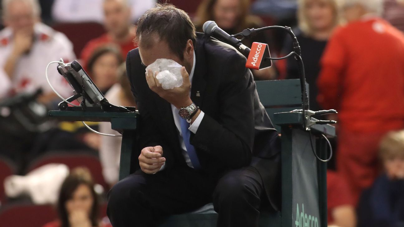 Denis Shapovalov Fined 7 000 After Hitting The Umpire In The Eye : This Is The Moment Furious Canadian Tennis Player Denis Shapovalov Fired A Ball Into The Face Of The Chair Umpire In Frustration At Losing A Point In A Davis Cup Match In Ottawa On Sunday.