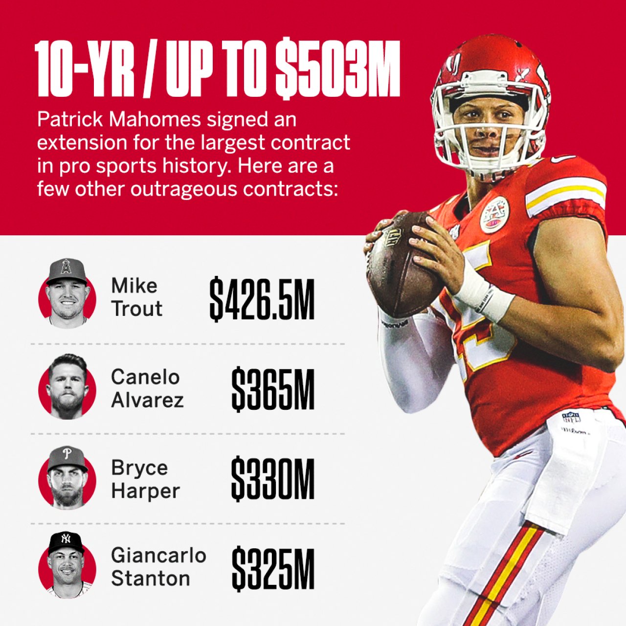 Chiefs Agree To 10 Year Extension For Patrick Mahomes. Since patrick mahomes entered the nfl in 2017, mahomes leads all qualified qbs in expected points added per dropback (0.26), a measure of passing efficiency.@patrickmahomes has been most efficient throughout his career in several of the most difficult passing situations: Patrick mahomes contract and salary cap details, full contract breakdowns, salaries, signing bonus, roster bonus, dead money, and valuations. Mahomes also gave the kansas city chiefs a nice discount in his new contract extension that could pay him half a billion dollars. However, mahomes' contract is a bit more complicated, even by nfl standards, than the graphics being trotted out on social media suggest. Mahomes' contract is the largest in north american sports history. Mahomes also says he's pretty sure he's not allowed to play basketball, baseball or pretty much every physical activity you could possibly do. The details of patrick mahomes' new contract. Patrick mahomes might be worth half a billion dollars now. Patrick mahomes just became a very rich man. Nfl contract specifics generally collected from verified reports. But can he enjoy a little jet ski action with that cash?? For starters, it's worth noting that the shiny $503 million number comes via some creative math. Patrick mahomes is now the owner of the richest contract in sports history and the first ever deal worth half of a billion dollars. To see the rest of the patrick mahomes' contract breakdowns. He beat out mike trout's $426 million deal by a fair bit.